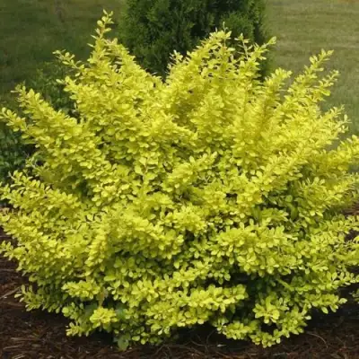Барбарис тунберга Ауреа многоствольный – по 15-20 центральных побегов на каждом кусте. На стеблях большое количество побочных ветвей, формирующих широкую крону. Присутствуют острые колючки.