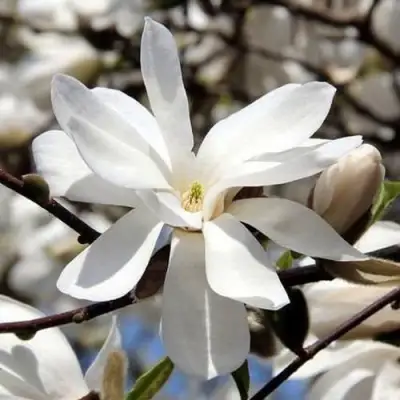 Крупный разветвленный кустарник с конусовидной кроной привлекателен в любое время года. Ранней весной его оливково-серебристые ветви покрываются цветами с овальными удлиненными лепестками. Благоухающие многолепестковые цветы белоснежные или с едва заметными лилово-розовыми полосками. Позже появляются интересные узкие ярко-зеленые глянцевые листья, которые осенью окрашиваются в благородный бронзовый цвет.