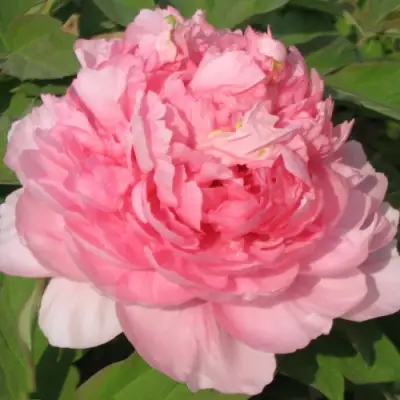 Цветы — главный элемент привлекательности этого сорта. Период цветения начинается в мае и продолжается 2–3 недели. Бутоны крупные, от 16 до 20 см в диаметре, густомахровые, с многорядным размещением лепестков. Окрас нежно-розовый с перламутровым отливом, в центре оттенок обычно более насыщенный, что усиливает глубину цвета. Лепестки широкие, волнистые, создают воздушную, почти шелковую структуру цветка. Форма напоминает раскрывающийся бутон пионов традиционных китайских сортов. Аромат тонкий и приятный, с лёгкой сладкостью, комфортный даже для тех, кто не любит ярко выраженные запахи.