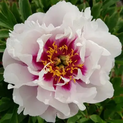 Цветы пиона Кора Луиза абсолютно уникальны: их крупные полумахровые бутоны достигают диаметра от 18 до 25 см. Окраска цветков кремово-белая с интригующим контрастом фиолетово-красного пятна у основания лепестков. Это двухцветное сочетание создает эффектный и запоминающийся образ, который будет привлекать взгляды. Цветы выглядят очень нежно и пышно, напоминают фарфоровые изделия, а их структура лепестков просто завораживает. Ярко-желтые тычинки добавляют еще больше яркости.