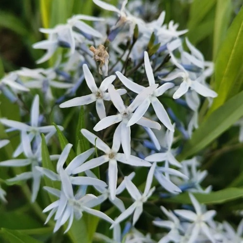 Цветение — отдельный акцент. В мае появляются метельчатые соцветия с десятками мелких звёздчатых цветков диаметром до 1,5 см. Окрас — чистый, спокойный голубой, который визуально охлаждает посадку и хорошо сочетается с другими природными многолетниками. Цветёт до четырёх недель, не теряя формы и привлекательности. Аромат лёгкий, едва уловимый. После цветения формируются продолговатые стручки с семенами — дополнительный декоративный элемент.