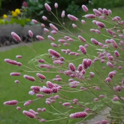 Цветение начинается в середине лета и продолжается до осени — до 8 недель непрерывного цветения. Цветки мелкие, собраны в продолговатые цилиндрические головки длиной около 6 см. Окрас — глубокий пурпурно-бордовый, подчёркивающий графичность и строгость формы. Соцветия расположены на прочных, тонких цветоносах, которые легко качаются на ветру, создавая живую динамику.